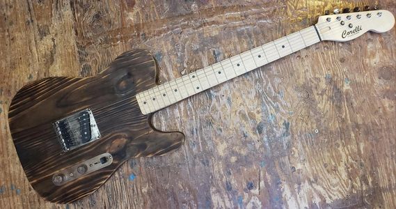 This build for my Tasmanian rebel pal Richard turned out to be so much fun that I may do some more in the near future. You'll see the band Borrison Ivy slaying them with this custom Corelli Barncaster made of old knotty pine reclaimed from an old Nevada brothel. If the walls could talk! This guitar SINGS! With mojo like that, it just gets better with Nick Bona's 'Bonafied' Tele Stack pickup which was custom wound specifically for this unique guitar. The neck is quartersawn eastern hard rock maple. An amazing player and ultimate "sleeper" guitar.